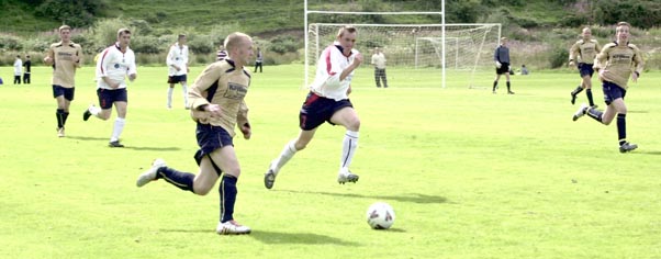 Keith Millar races goalwards in the game against Dunollie chased by Diarmid MacMillan.
