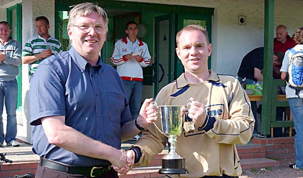 Tournament organiser David Buchanan hands over the Argyll and Bute Cup to Oban Saints captain Graeme Niven.