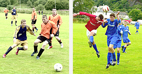 Left: Oban Saints Dean Cassells takes on the Campbeltown Boys defence. Right: Dunoon's John Vinson and Oban Saints Under 19 midfielder Myles MacAulay challenge for a high ball