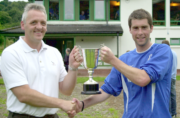 Oban Saints manager Iain Jackson hands over the Argyll and Bute Cup to Dunoon skipper John Vinson