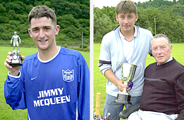 Left - Player of the Tournament Dunoon's Stewart MacIntyre. Right: Dunoon manager Stewart MacIntyre (no relation) and sponsor Peter Muldoon face the camera with the Argyll and Bute Cup