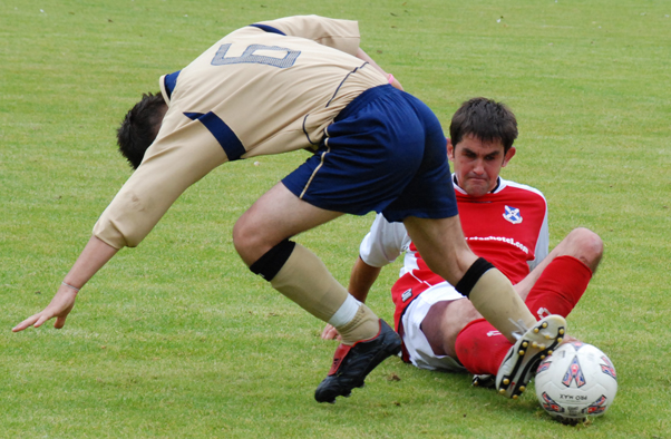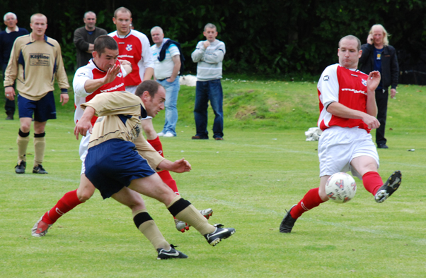 Lochgilphead Red Star defender Iain Houston tries to block this pile driver from Saints striker Darin Bryars