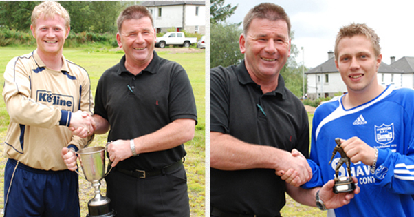 Left: Oban Saints captain Bertie Gemmell is presented with the Argyll and Bute Cup by Councillor Roddie McCuish. Right: Dunoon's George MacDonald receives his Player of the Tournament award from Councillor McCuish