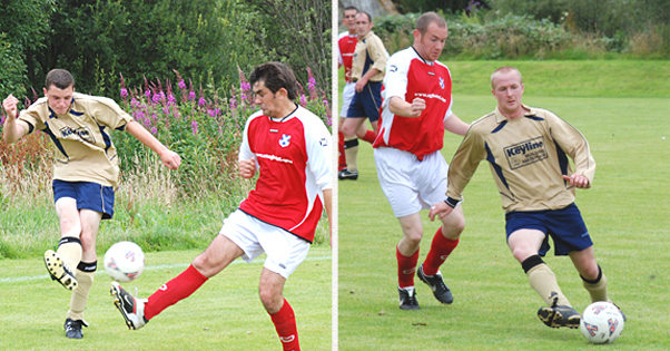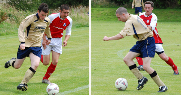 Left: Myles MacAulay gets a right foot cross into the box. Right: Keith Millar controls the ball in midfield.