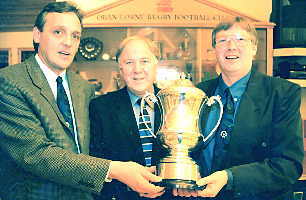 Oban Saints were the first Argyll team to win the Scottish Amateur League Premier Division One League Championship in 1998. Pictured are manager Iain Jackson (left) and club secretary David Buchanan (right) with former Scotland head coach and Preston North End manager Craig Brown who handed over the handsome trophy at a civic reception given by Argyll and Bute Council.