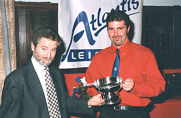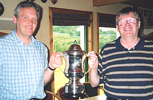 Saints won the Scottish Amateur League Premier Division One Championship for the second time in 2002 (the second league championship in four years). Pictured with the impressive trophy is team manager Iain Jackson and club secretary David Buchanan