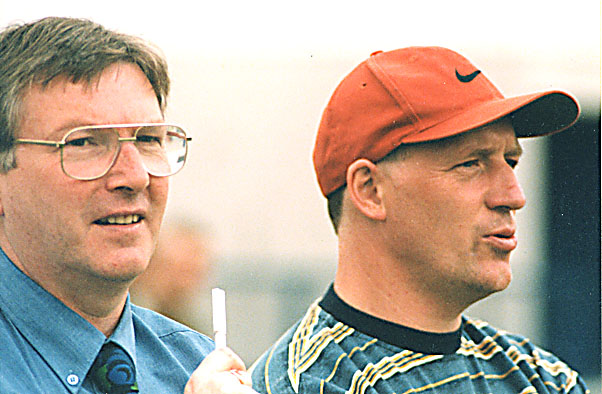 Saints secretary David Buchanan and coach Peter MacCallum watch intently as the Oban side go for victory in a league match during their Premier Division One Championship winning season of 2002.