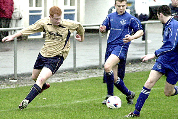 Duncan Campbell goes past two Weir Recreation defenders before crossing the ball for Saints first goal scored by Dean Walker in the West of Scotland Cup second round tie held at Mossfield Stadium, Oban on January 15th, 2005. Saints won the game 5-0.