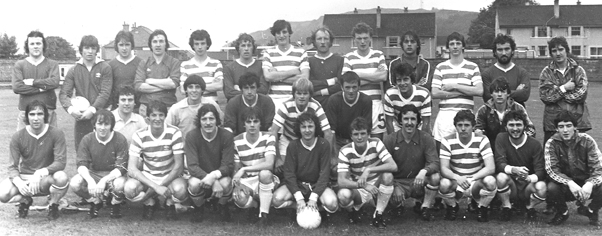 Oban Saints and a team of Scottish 'All Stars' face the camera in 1978. The 'All Stars' team included George 'Dandy' McLean (Rangers) along with Scottish Internationalists John Hughes and Billy McNeill (both Celtic). The Saints squad (in white) Back Row (L to R) David Buchanan, John MacEachen, Willie Madej, Eric Smith, Peter Clark, Peter MacDougall. Front Row (L to R) Peter MacCallum, David Thomson, Robert Clark, Nigel Evans, Ronnie Welsh, Peter Laird and John Plunkett.