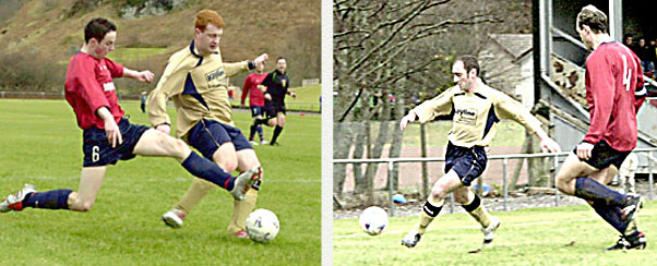 Left: Duncan Campbell evades this tackle from Dunoon's Chris Stinson during their Scottish Amateur Cup fifth round tie at Mossfield Stadium, Oban, on 29th January, 2005. Right: Dunoon's Kjeld Thorup closes in on Oban Saints striker Darin Bryars. The game ended in a 1-1 draw.
