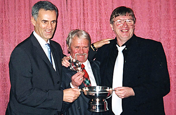 Club secretary David Buchanan won the 'Administrator of the Year' Award at the Atlantis Leisure Sports Awards Dinner in 2002. He is pictured with Jim Fleeting, head of the Scottish Football Association's Community Development Programme and cartoonist Malky McCormick who presented the award.