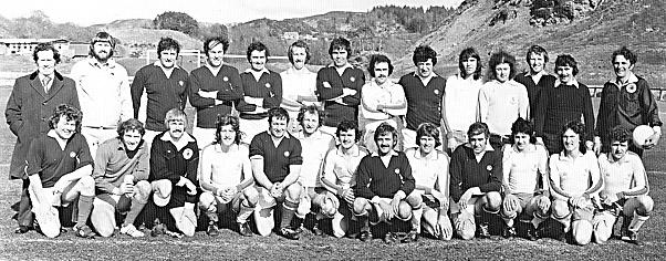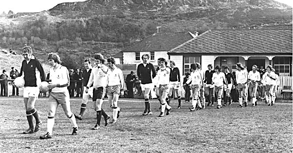 Oban Saints played a Mid Argyll Select to open the new Argyll & Bute Hospital Park in Lochgilphead during the 1970s. The Oban side (in white) are Back Row (L to R) - Sandy Cameron, David Buchanan, Iain Steele, John Kirkpatrick, George McLuckie. Front Row (L to R) - Willie Madej, Peter Bush, Ivor Clark, Alan Morrison (black), Mark Mason, Henrik Madej and Robert Clark.