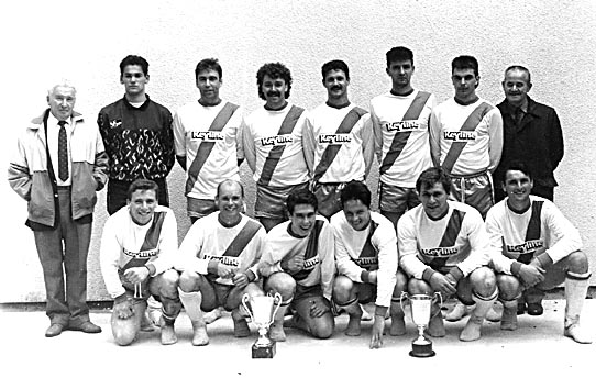 Saints pictured with the Keyline Challenge Cup which they won in 1994. Back Row (L to R) David Buchanan (secretary), Alistair MacLaren, (No 1 supporter) Brian McGleish, David Dunlop, Angus MacEachan and John MacEachan (Keyline representatives). Middle Row (L to R) Iain Jackson (player/manager) Finlay O'Rourke, Andrew Wilson, Allan MacLellan, Stewart Duncan and Colin Campbell. Front Row (L to R) Frank Beaton, Steven MacLeod (mascot), David MacLeod, Steven Plunkett, Keith MacCallum, Colin MacCallum (mascot), Andy MacLeod, Donald MacLennan and Colin 'Shuggie' Campbell.