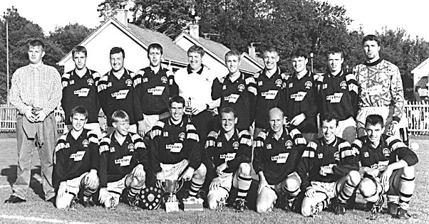 Oban Saints, first ever winners of the Premier Division Two league championship in 1994. Back Row (L to R): Iain Jackson (player/manager), David Dunlop and Brian McGleish. Middle Row (L to R): John Buchanan (chairman), Angus MacEachan (Keyline - sponsors), David MacLeod, Finlay O'Rourke Stewart Duncan, Allan MacLellan and David Buchanan (secretary). Front Row (L to R): Andrew Wilson, Andy MacLeod, Keith MacCallum, Donald MacLennan and Frank Beaton