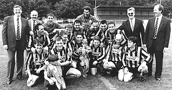 Saints retained the Mansell Memorial Trophy against Kinlochleven United in 1990: Back Row (L to R) John Buchanan, chairman, John Fegan, Eric Smith, David Archibald, Colin Welsh, Alan MacPhail, Stewart Duncan, Alistair MacLaren. Front Row (L to R) Jimmy MacPhee, Donald MacLennan, Keith MacCallum, Donald MacVicar, Alan MacDougall and Alex MacVicar. The other trophy on display is the Argyll and Bute Cup which the club also won that year.