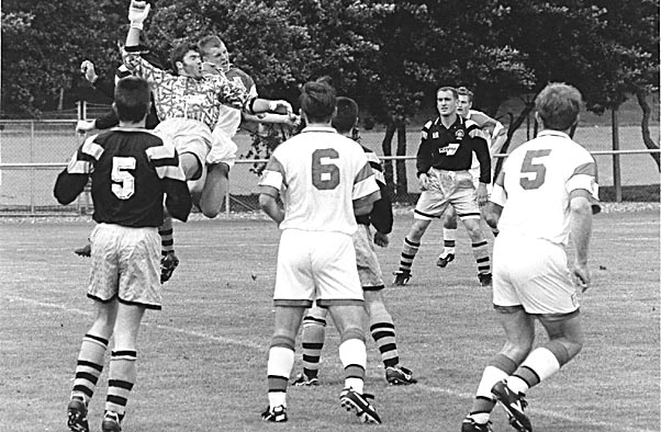 Saints goalkeeper David Dunlop challenges for a high ball with Clydebank's Paul Lovering during a friendly match at Mossfield Stadium in 1998. Unfortunatley, the Scottish First Division team, who made several trips to Oban, folded a few years ago.