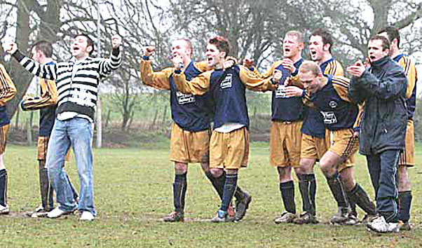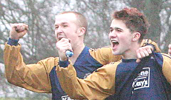 Keith Millar and Ross Graham celebrate Mark MacCallum's penalty against Ancrum that took the Oban side into the 4th round of the Soccer World Scottish Amateur Cup. This was the replay of the game in Oban which ended in a 1-1 draw. The game finished 1-1 in Ancrum as well, after extra time, but Saints won the penalty shoot-out 3-0.