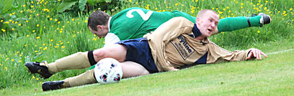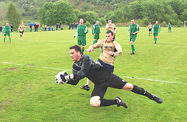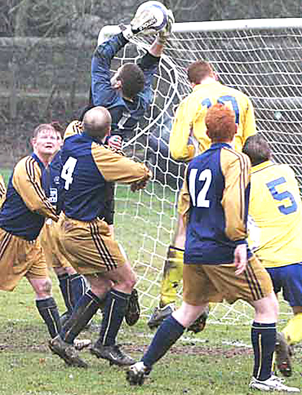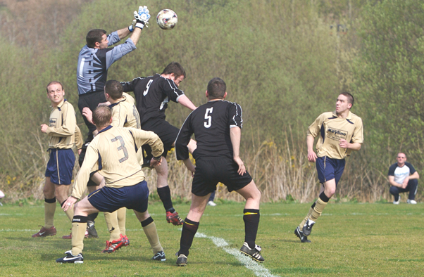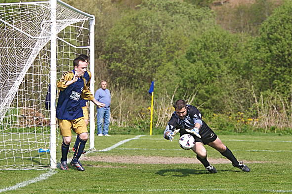 Heading for a fall! Sean Ford (foot a bit high Sean) collides with Gartcosh keeper Chris Hughes.