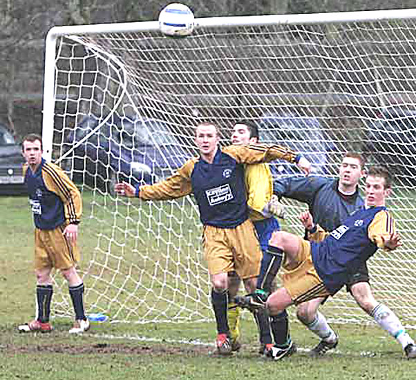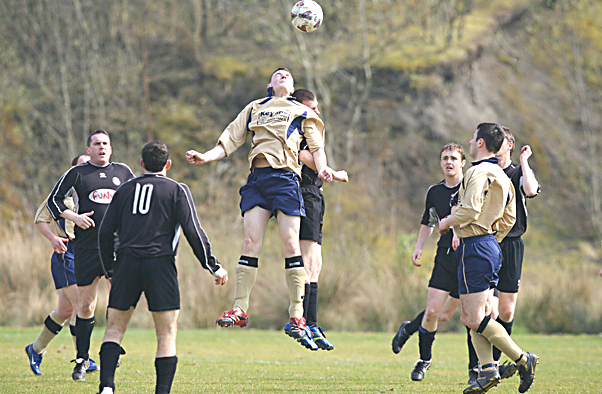 Up, up and away! Keith Millar gets in a header during the 2-1 win over Gartcosh.