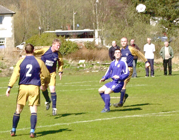 Saints skipper Bertie Gemmell heads clear watched by Gartcosh striker David Darroch, team mates Mark MacCallum (No 2) and Alex Grindlay. This Premier Division league game was played at Glencruitten Park on Saturday 29th April, 2006 and finished 0-0.