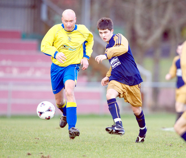 Striker Darin Bryars chases down Denny defender Alan Campbell during their West of Scotland Cup tie at Glencruitten on Saturday 11th Fabruary, 2006. Saints won the match 3-1.