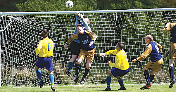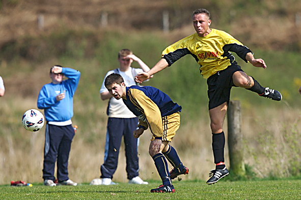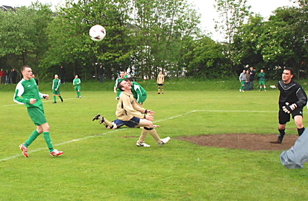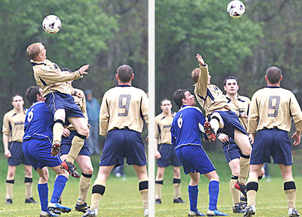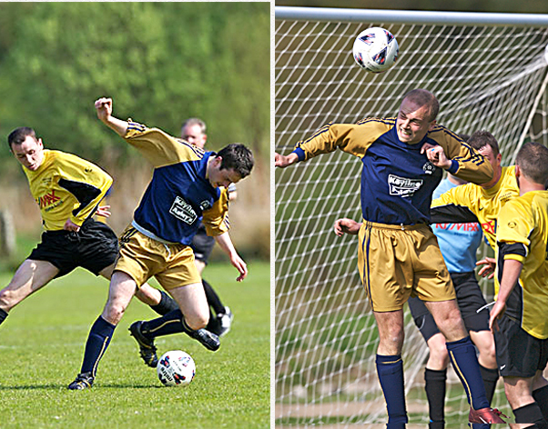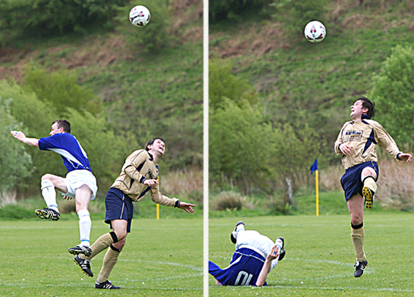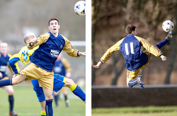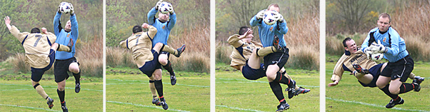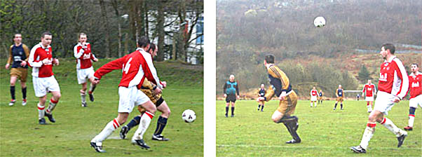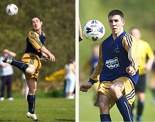 Left: Donald Campbell wins a header against Iain Mitchell. Right: Donald brings the ball under control with an acrobatic leap.