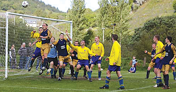 Left: Darin Bryars takes on the Kilpatrick defence. Right: Dante Lopez waits for this high ball to come into the box Photos: Marian Millar, The Oban Times