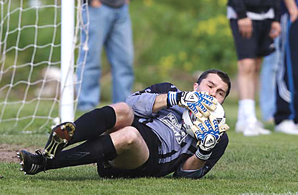 Saints keeper David Dunlop saves this shot with Sean Ford guarding the post.