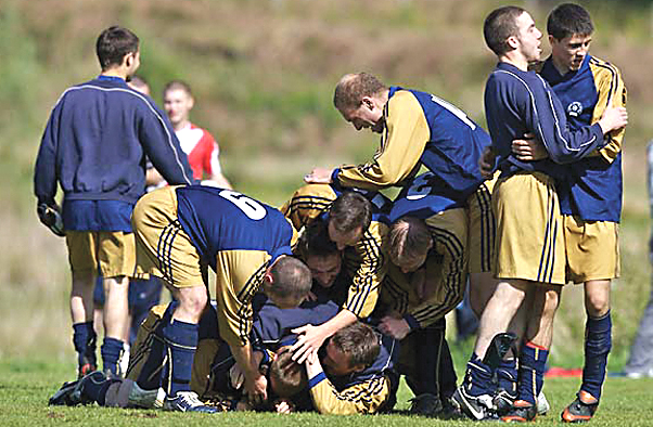 Yes! match winner Ross Maitland is in this picture (at the bottom of the pile), surrounded by happy team-mates and substitutes after he had scored the vital winning goal in injury time against Gartcosh United at Glencruitten on Sunday 20th May, 2007. Photographs: John MacTavish