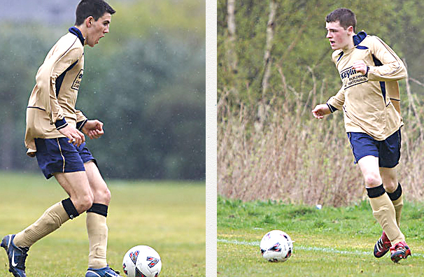 Left: Darin Bryars flicks the ball on with his head. Right: Donald Campbell brings the ball under control.