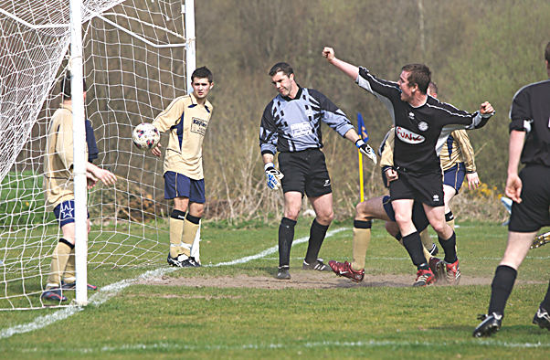 A dejected Saints goalkeeper David Dunlop looks on as Inverclyde's Chris MacFarlane celebrates his equaliser against the Oban team during the Jimmy Marshall Trophy match held at Glencruitten on Saturday 14th April, 2007, but Saints had the last laugh as they won the game 2-1. Photos John MacTavish