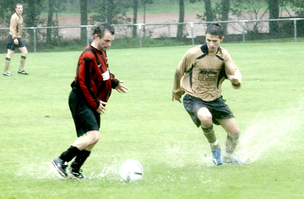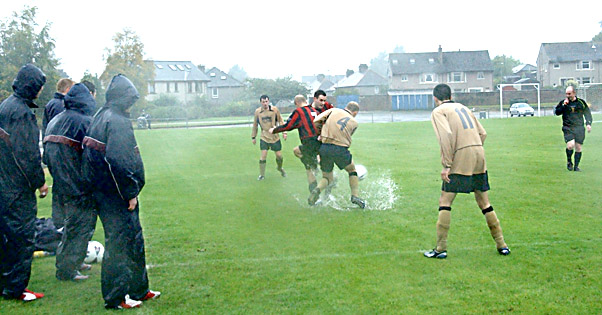 Kelvinbank's Mark McGraw and Ross Graham battle through the puddles during their Soccer World Scottish Amateur Cup tie played in horrendous conditions at Mossfield Stadium, Oban on Saturday 7th October, 2006. Saints won 3-1 with goal from Allan MacKay (2) and Donald Campbell. Photographs: Hugh Ross, The Oban Times
