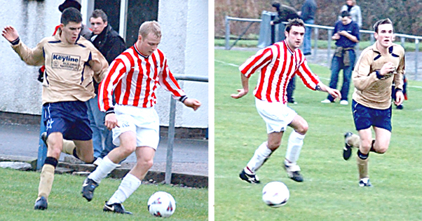 Left: A Newmilns defender shields the ball from Donald Campbell. Right: Willie Gemmell in a race for the ball.