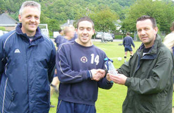 Oban Saints Supporters Club Hostel End Branch President Stuart Gibson presents Marc MacCallum with a bottle of Black Lynn water after he had been voted their Player of the Year. A bemused team manager Iain Jackson looks on in amazement. Photographer: unknown (thank goodness)