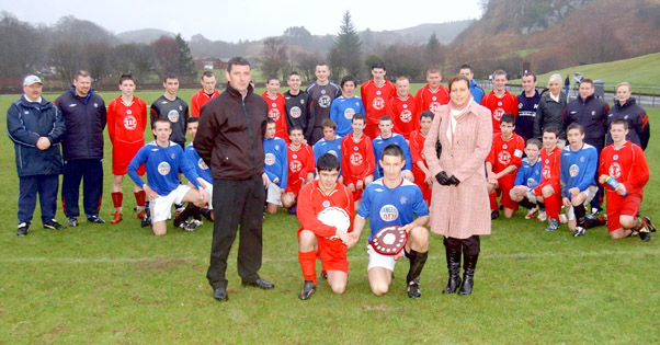 Rangers sent an under 15 team to take on an Oban Saints Youth Select for the Ryan MacPhail Memorial Trophy at Mossfield Stadium on Sunday 28th January, 2007. Rangers won the game 7-0. Ryan was tragically killed in a sledging accident in 2003. Pictured with the two teams are Ryan's parents Alan and Amanda along with the team captains Matt Rippon, Oban Saints and Chris Scott, Rangers. Photos: Euan Paterson, The Oban Times