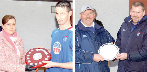 Left: Ryan's mum Amanda presents the Ryan MacPhail Memorial Trophy to Rangers captain Chris Scott. Right: Rangers coach Ally Dawson presents Oban Saints Youth team coach Duncan MacKinnon with a silver salver as a memento of the occasion. The salver was then presented to the MacPhail family by the Oban club.