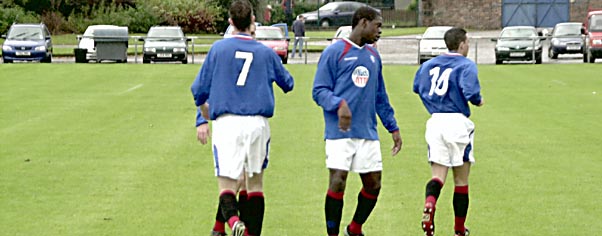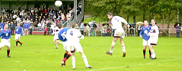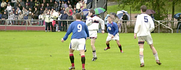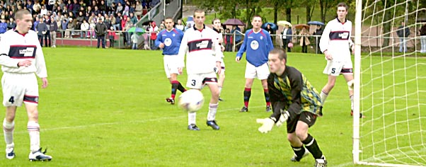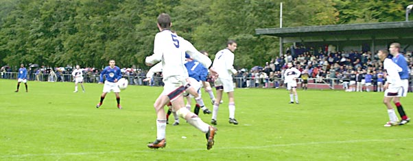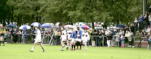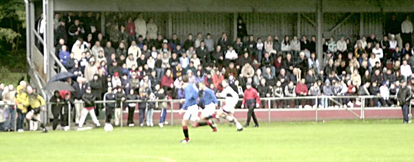 A large crowd packed into Oban's Mossfield Stadium despite the horrendous weather conditions to watch the game between Saints Under 18s and a strong Glasgow Rangers side. Photographs courtesy of The Oban Times | Sunday 5th October, 2003 - Ryan MacPhail Memorial Trophy RANGERS NET FIVE TO LIFT RYAN'S MEMORIAL TROPHY Oban Saints Under 18s 0 Glasgow Rangers Under 18s 5 | | Oban Saints Under 18s entertained Glasgow Rangers Under 18s for the Ryan MacPhail Memorial Trophy at Mossfield Stadium on Sunday 5th October, 2003. The game was played in memory of young Ryan MacPhail who tragically died in January of this year in a sledging accident. Ryan was a great Rangers supporter and it was fitting that the Glasgow giants travelled to Oban for this fixture. Despite the horrendous weather a large crowd packed Mossfield Stadium for the game against a very strong Rangers team which included seven Scottish Internationalists. Before kick-off both sets of players and the crowd stood for a minute's silence in memory of Ryan. The game began brightly, but it took the local side fully five minutes to get the ball off the slick-moving Ibrox outfit, whose passing was superb throughout the afternoon. However, once the Saints youngsters settled down they created a couple of really good chances. Dean Smith had a great opportunity and Willie Gemmell hit the post with a well struck shot. Craig Campbell also had a couple of efforts but these went over the bar. Rangers opened the scoring on the twenty minute mark when the ball was switched from the left back position to the right flank where the unmarked Rangers winger Brian MacLean drove a low shot past Allan MacLellan in the Saints goals. The Saints keeper had a tremendous game as he kept his side in the match with a string of fine saves. The score remained at 1-0 until the interval. During the half time break Saints manager Rab Smith replaced the hard working Alan Miller with Calum Fox. During the second half Rangers began to show thier class and added another four goals without reply through John Douglas, who curled a great shot just under the bar, Ross McCormick then netted from the penalty spot and substitute John Johnston put the icing on the cake for the Ibrox side with two late goals to make the final score 5-0. Although well beaten in the end by their illustriious opponents the young Saints players can take a great deal of credit for the way they played with determination, passion and no lack of skill, which was commented on by Rangers youth development officer George Adams. At a reception held in Oban Lorne Rugby Club after the game Saints Under 18 secretary David Mitchell thanked everybody involved in making the day such a huge success - match officials John Scott, David Dunlop and David Paterson; John MacGregor for producing a superb buffet; Glenda MacLeod for the lovely cake with the Oban Saints and Rangers Club badges painted on the top; the loyal band of helpers who sold the raffle tickets and took the collection in such abysmal weather conditons, and of course the world famous Glasgow Rangers for coming to play for Ryan's Trophy. David explained that it was the intention to make this an annual fixture and not just a one off game. He then asked the MacPhail family to present the man of the match awards to Willie Gemmell of Saints and Andy Gabey for Rangers. The MacPhails then presented the handsome trophy to George Adams, who promptly returned it and asked that it be kept in Oban, but he would be back to pick it up again next year. George and Rangers Under 18 coach David Kirkwood said that the Rangers party had thoroughly enjoyed their trip to Oban, despite the weather, and were looking forward to coming back next year to defend the trophy. The money raised from the raffle and the kind donations mean that well over £1000 will be given to the newly-formed football development group to help youth football in the area. The Glasgow club kindly donated a football top signed by the Rangers first team squad and this was won by Stewart Alexander. The day was a fitting tribute to Ryan who was a fine young man and his parents Alan and Amanda, along with his brother and sister Jenna and Jason, must have been very proud.