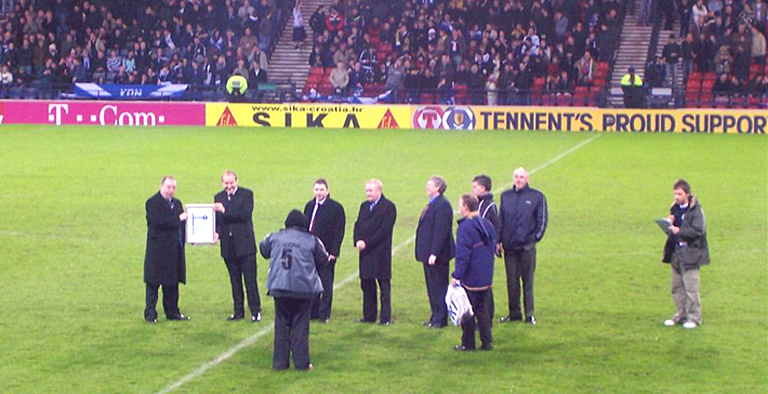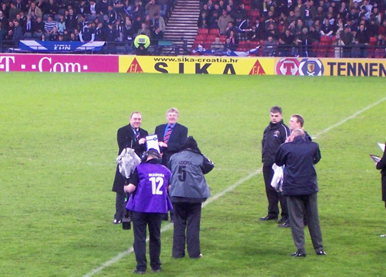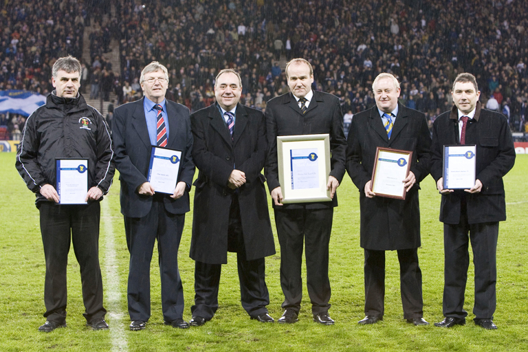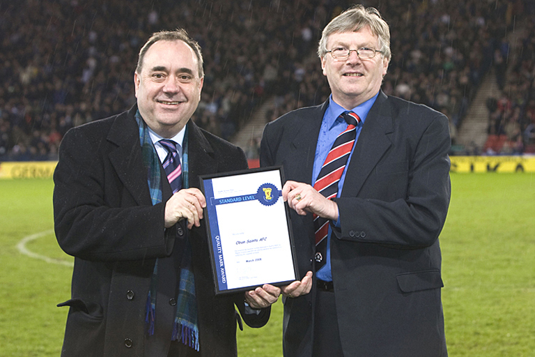 Oban Saints club secretary David Buchanan receives the Scottish Football Association's Standard Club Quality Mark Award from First Minister Alex Salmond during the half time interval at the Scotland v Croatia international played at Hampden Park on Wednesday 26th March, 2008. The club would like to thank Argyll and Bute Football Development officer Dylan Kerr and SFA West Regional Manager Paul McNeill for their help in achieving this award. Saints were given the top Quality Mark award of Community Club in December 2009.