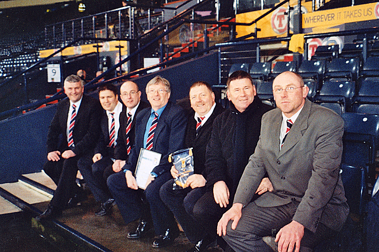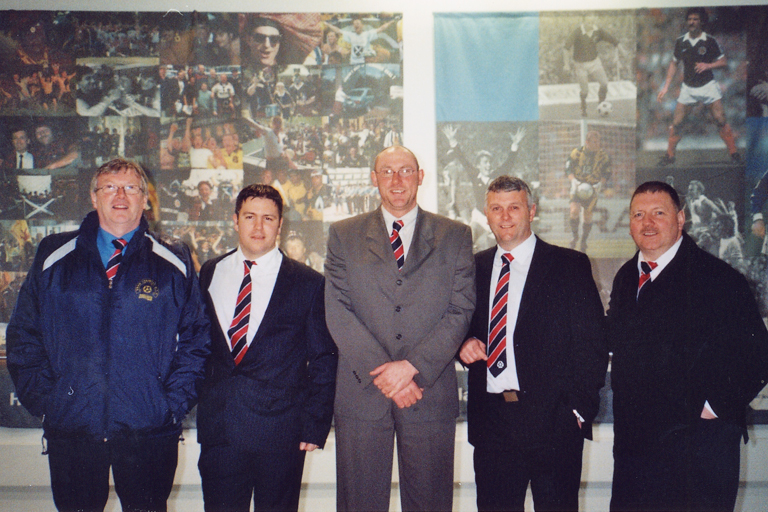 David Buchanan, Peter MacMillan, Thomas Sharp, Iain Alexander and Duncan MacKinnon outside the Scottish Football Association's Hall of Fame at Hampden Park.