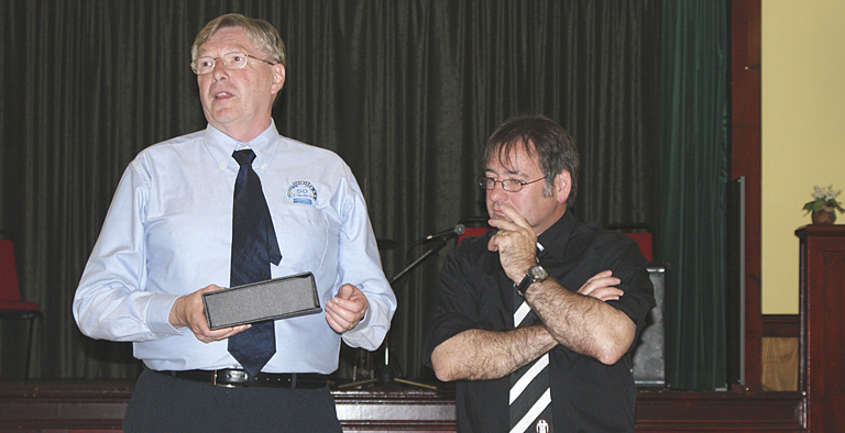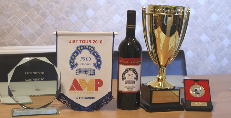 Saints presented Southend with a commemorative plaque and pennant to celebrate their 50th anniversary. Also in the picture is a bottle of Oban Saints 50th anniversary wine, the Friendship Cup and Medals.
