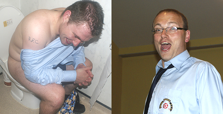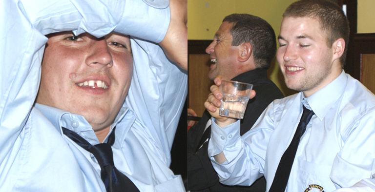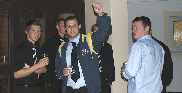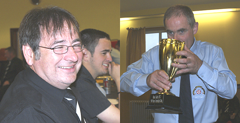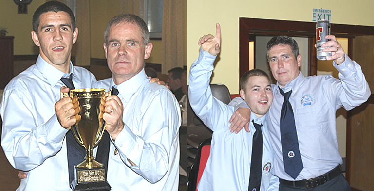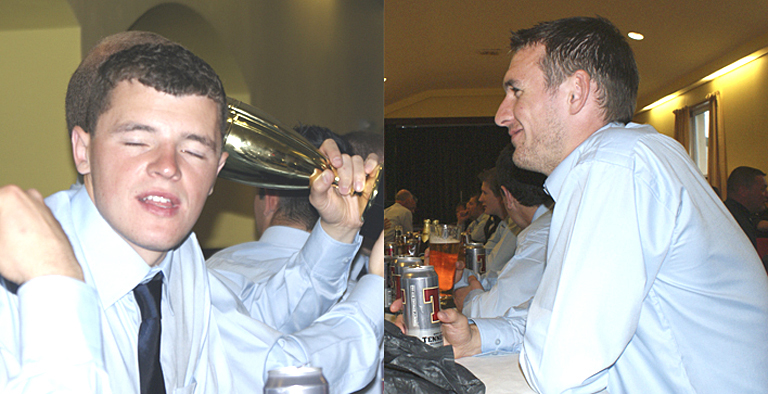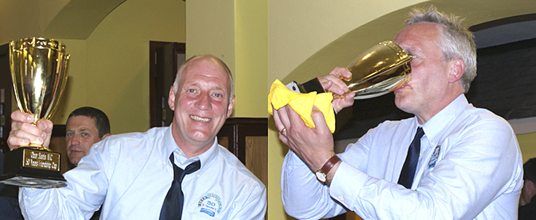 Donald and Angus dance with the cup - Chris and Pele dance with the lager!!!