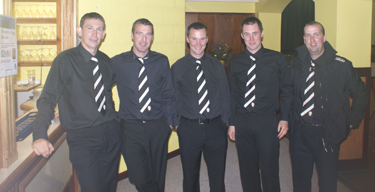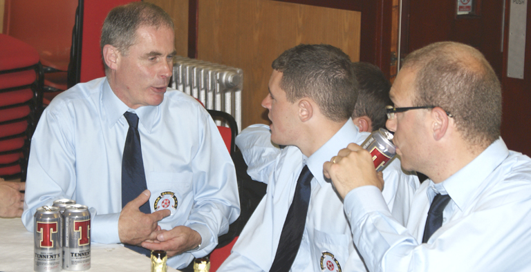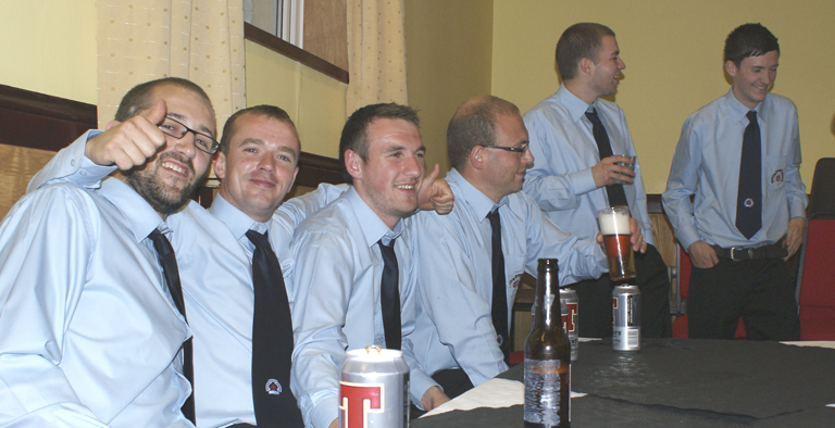 The Saints management team - Iain Jackson, Pele MacCallum, Angus MacPhee, David Buchanan and Peter MacCallum in the Borrodale Hotel before going to the Southend 50th anniversay celebrations.