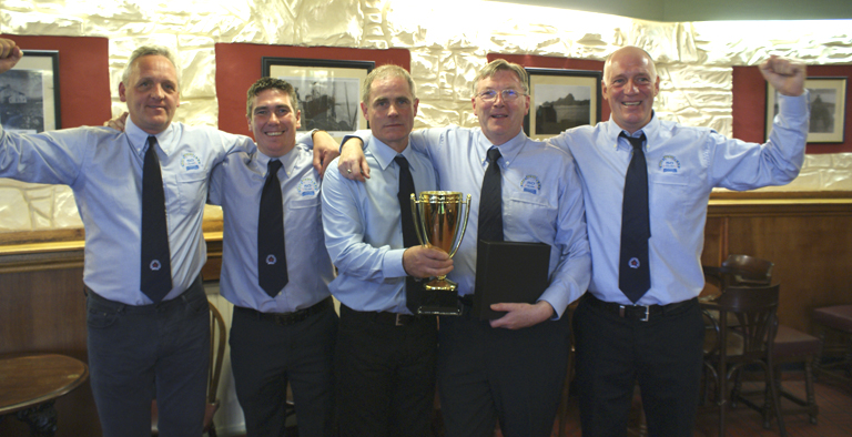Keith Millar holds aloft the Friendship Cup watched by his team mates.