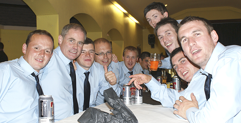 The smartly dressed Saints squad celebrate the cup win in the Borrodale Hotel - they weren't so smartly dressed at 3 o'clock the next morning.